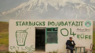 "Bulaşık suyu tadında kahveleriyle (mocca late) ünlü zevksizlik örneği Amerikan cafesi degil, Tezek sobası üstünde mistik Ağrı dagi manzarasında sıcak ve demli bir çay. (50 kr) Üstelik "paran yoksa kalsın agabey" tadında.." diyen Sayan'ın paylaştığı fotoğrafta ise üzerinde Starbucks Doğubayazıt Büfe 4 yazan bir kulübe görülüyor.