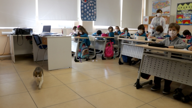 Edirne Keşan'da Raşit Efendi İlkokulu'nda öğrenciler, 3 ay önce soğuk havada okulun bahçesine gelen kediyi üşümemesi için sınıfa aldı.