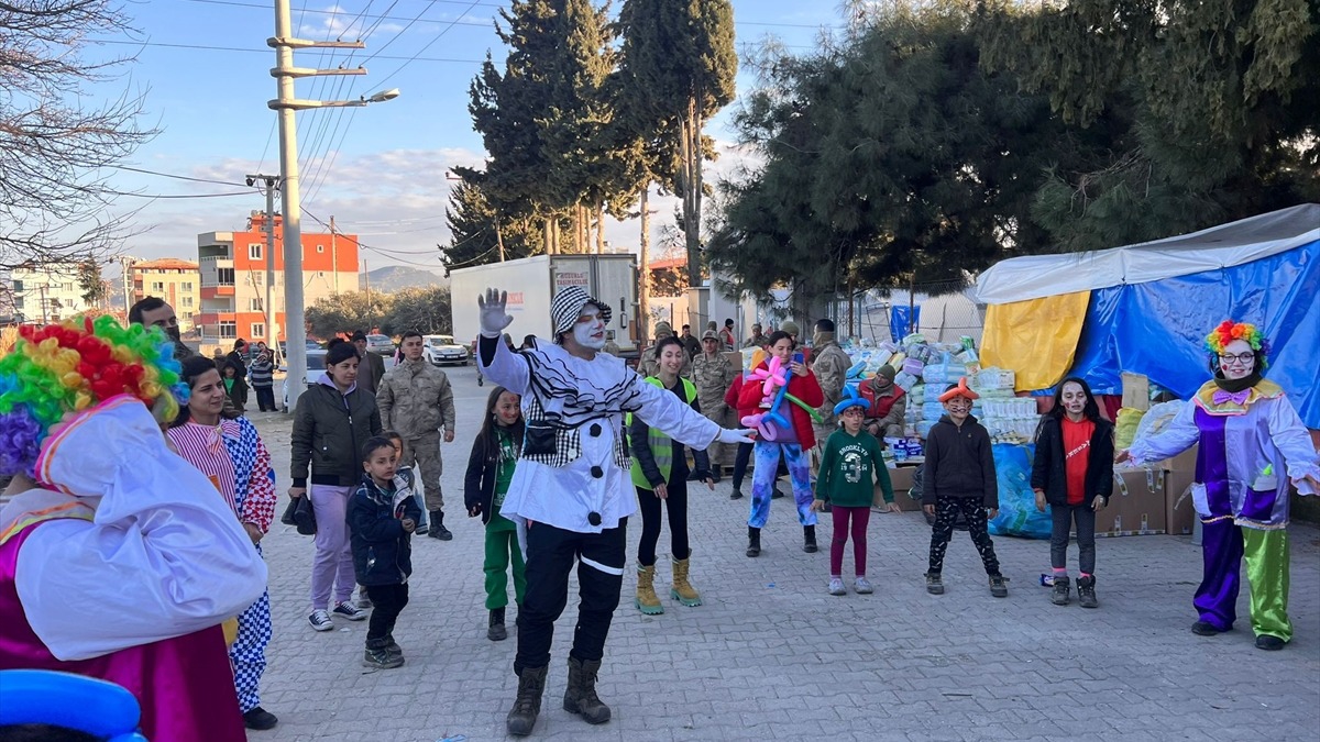 Hatay'da çadır kentlerde kalan çocuklar için yüz boyama, müzikle dans, animasyon gösterileri, yarışmalar gibi çeşitli etkinlikler düzenliyor.