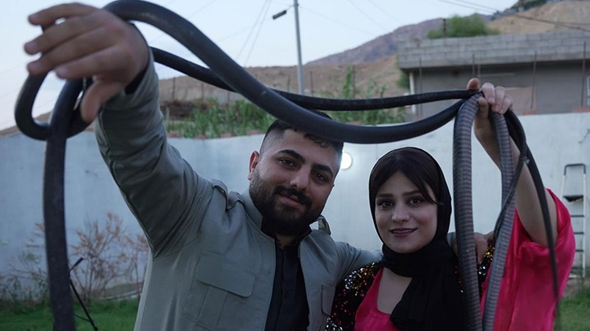 Irak'ın Süleymaniye'ye bağlı Dokan ilçesinin Kemçohe köyünde yaşayan Nuşirevan Abdurrahman ile Şıler Selim, evlerinde besledikleri yılanların derilerinden elde ettikleri yağlarla geçimlerini temin ediyor.