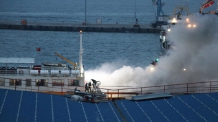 Feribottaki araçların zarar gördüğü yangın nedeniyle soğutma çalışmaları devam ediyor.