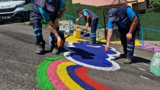 İzmit Belediyesi'nde görevli temizlik personeli, mahallelerdeki merdivenleri rengarenk boyuyor. Boyaya yeteneği olan temizlik personeli, merdivenleri boyarken, asfalt ve duvarları da resimler yaparak, renklendiriyor.