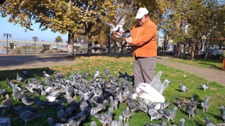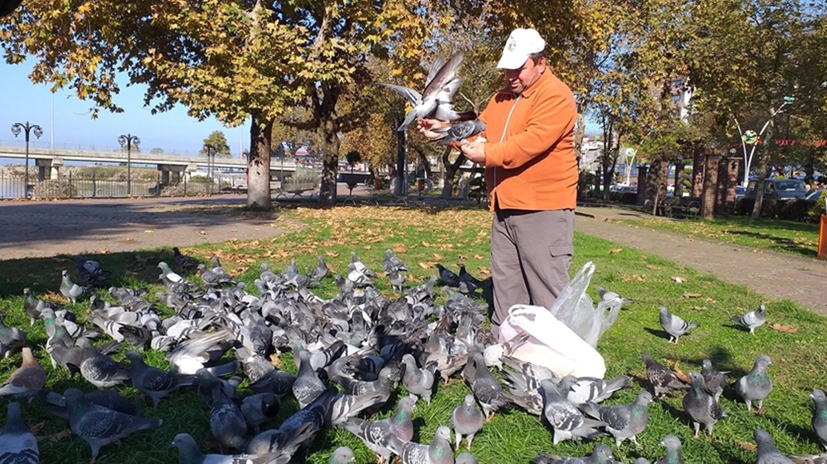 "Elimden geldiği kadar güvercinleri ve diğer sokak hayvanlarını aç bırakmamaya çalışıyorum. Bazen benim aldığımı bildikleri için vatandaşlar ekmek artıklarını poşetlere koyup çöp konteynerlerinin kenarına koyuyorlar. Ekmek artıklarını alıp parka gidiyorum, güvercinler hemen toplanıyor. Bazen sokak köpekleri ve kediler de geliyor. Onları besledikten sonra tekrar işimin başına dönüyorum."