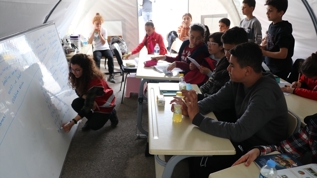 Hatay'da kente gönüllü olarak gelen öğretmenler, çadır ve konteyner kentlerde oluşturulan sınıflarda "her yerde ve şartta eğitim" parolasıyla eğitim desteği sunuyor.