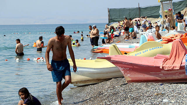Dünyanın en büyük sodalı gölü, Türkiye'nin de en büyük gölü olan Van Gölü, havaların ısınmasıyla birlikte vatandaşların uğrak yerleri arasında bulunuyor. Denizden yüksekliği yaklaşık bin 700 metre, yüzölçümü 3 bin 713 kilometrekare, derinliği ise yaklaşık 500 metreyi bulan Van Gölü, yani Vanlıların deyimiyle Van Denizi, doğal güzellikleri ve saklı koylarıyla dikkat çekiyor. Denize kıyısı olmadığı halde mavi bayrak verilen ilk plaj olan Van'daki Mollakasım Halk Plajı ise havaların ısınmasıyla birlikte doldu taştı. Uzun geçen kış mevsiminin ardından sıcak havanın tadını çıkaran vatandaşlar, kendilerini Van Gölü sahillerine attı. Van Gölü sahilleri hem göle girmek isteyenlerin hem de piknikçilerle dolup taşarken görüntüler de Ege ve Akdeniz sahillerini aratmıyor.
