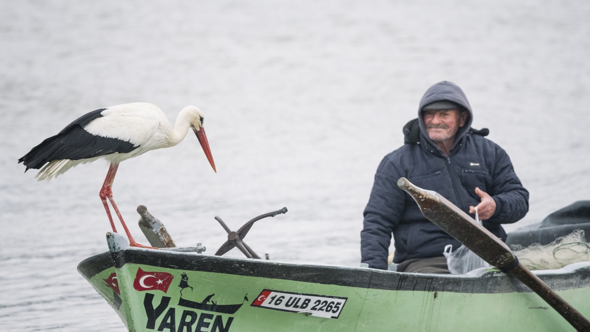 Bursa'nın Karacabey ilçesinde, balıkçı Adem Yılmaz ile kurduğu dostluk hikayesiyle milyonların gönlüne taht kuran Yaren Leylek, 12. yılda da göçten gelip Eskikaraağaç leylek köyündeki dostu Adem Yılmaz'ın kayığına kondu.