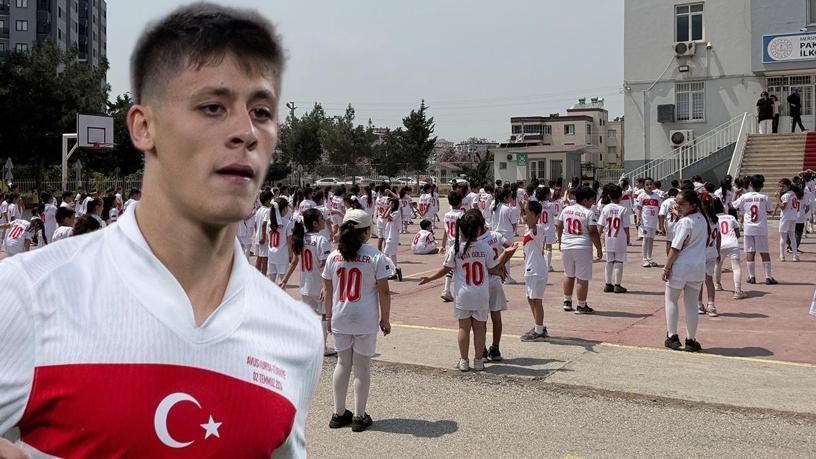 Mersin'in Tarsus ilçesindeki bir ilkokulda yaklaşık 400 öğrenci, sırtlarında "Arda" yazılı 10 numaralı milli formalarıyla, Real Madrid'de top koşturan yıldız futbolcu Arda Güler'i okullarına davet etti.