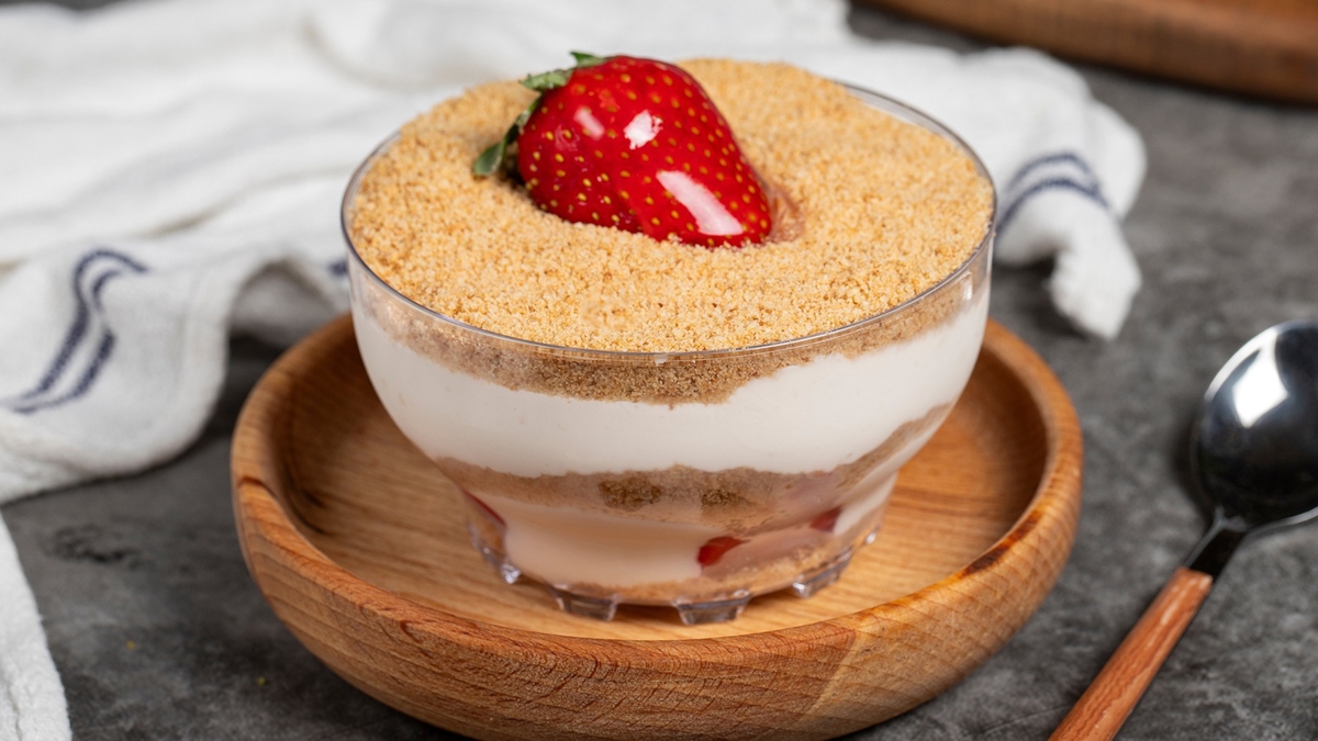 8. Sıra en keyifli kısma geldi. İlk olarak bisküvi sonra çilek sonra muhallebi, sonra tekrar bisküvi çilek ve tekrar muhallebi ve en son üste bisküvi koyup üzerini süsleyin. Evde çilek yoksa kiviyle de yapabilirsiniz. Afiyet olsun.