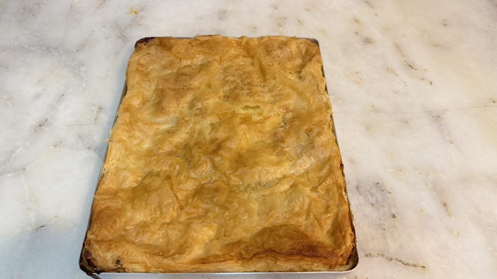 Fırından çıkarılan tepsideki muhallebi üzerine, aralarına eritilmiş tereyağı sürülerek 5 yufka daha eklenir.