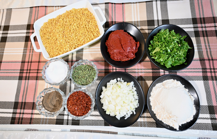 Suyunu çeken bulgura ince kıyılmış maydanoz, pul biber, karabiber, tuz ve unun yarısı konulup kontrollü olarak su ekleyerek yumuşak hamur kıvamına getirilir.