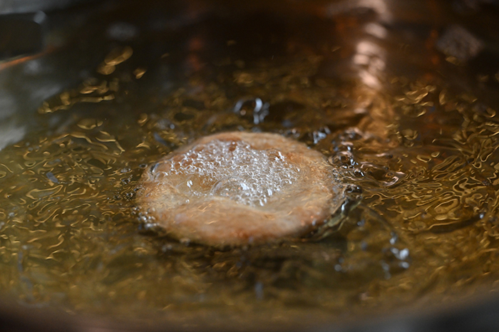 8. Avuç içi kadar yuvarlak hale getirilen hamur, kısık ateşte kızgın yağın içerisinde pişirilir.